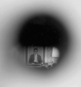 spectateur regarde à travers deux trous dans le mur, à travers la tête de la